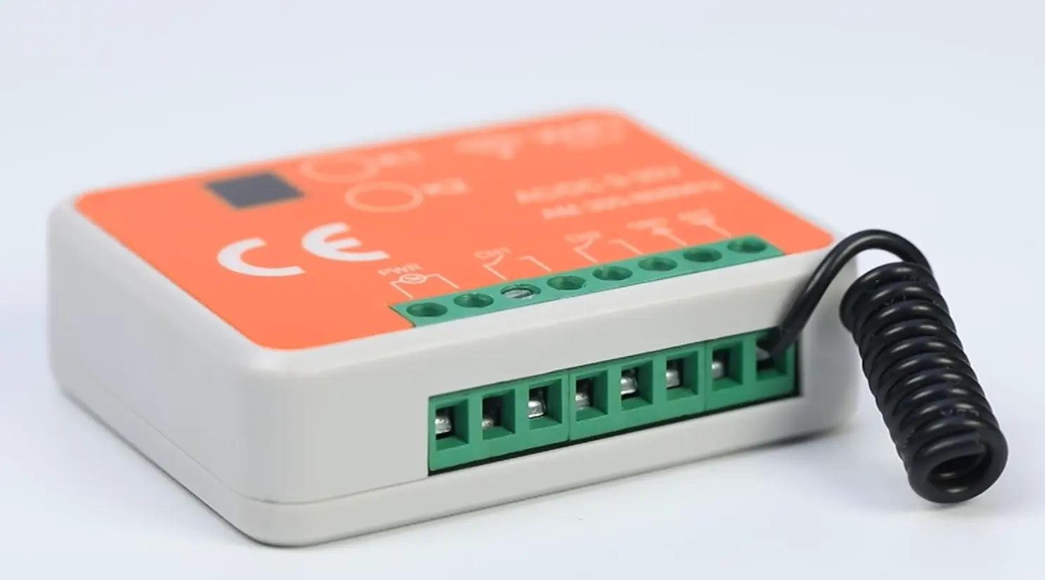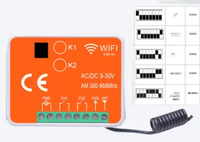 Es un receptor multifrecuencia universal, 300-868 MHz, que puede funcionar con código variable. Compatible con 18 marcas de control remoto, seleccionables mediante el interruptor DIP switch de 8 bits. Cada canal tiene botones de aprendizaje independientes, K1 y K2.