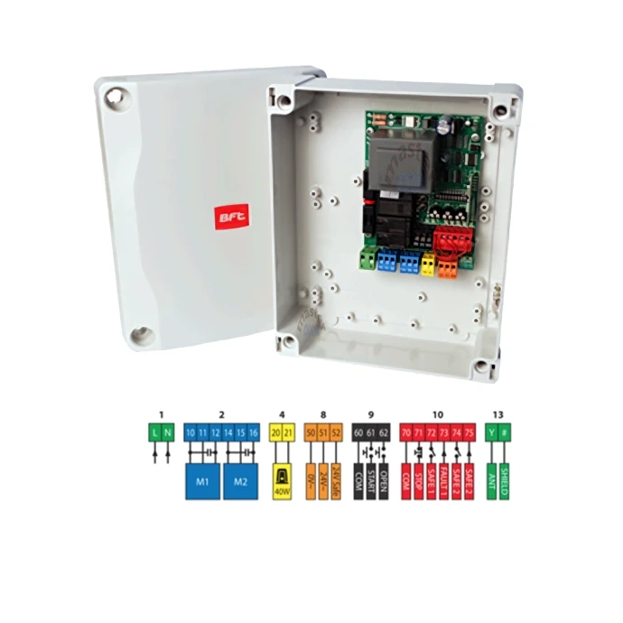 Sistema de programación accesible mediante DIP switch y TRIMMER sin necesidad de equipos especiales. Configuración rápida de parámetros y funciones. Entradas de mando para inicio y apertura, salida para luz intermitente.