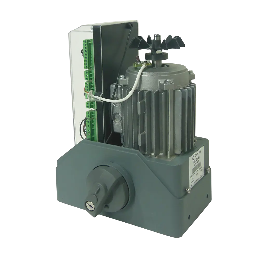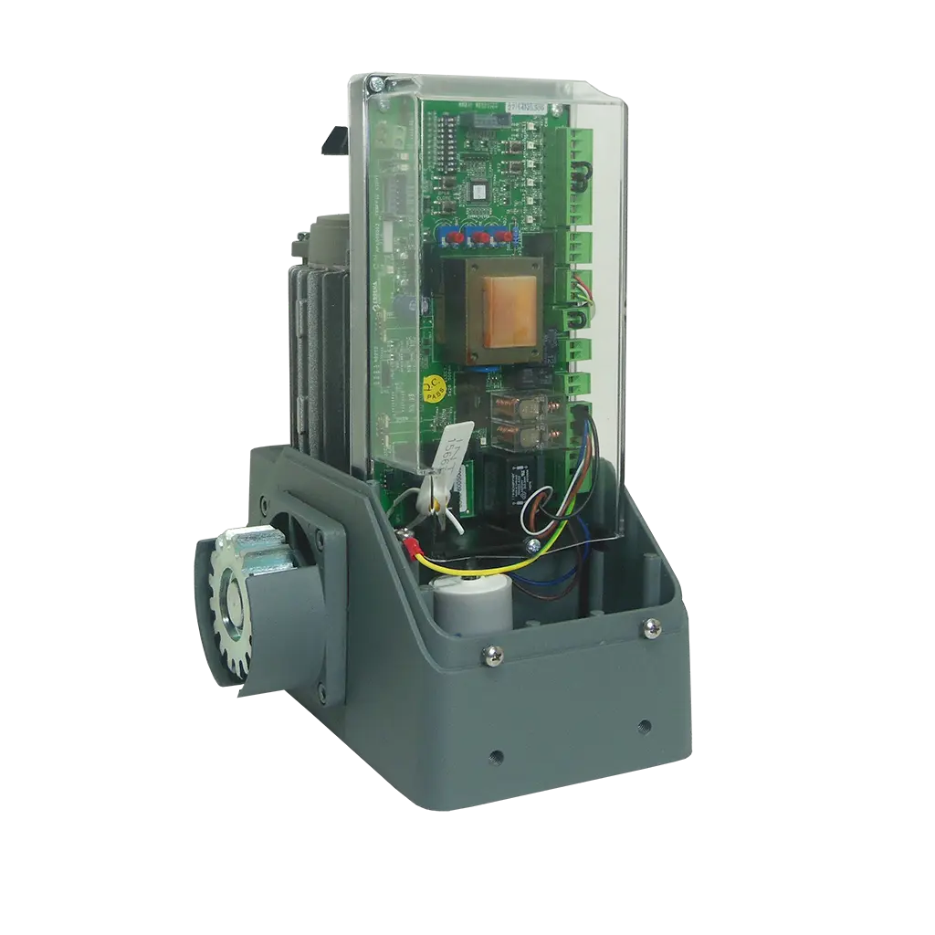 Motor electromecánico de alto rendimiento con tecnología Inverter para puertas corredizas residenciales, comerciales e industriales de hasta 1,000 kg. Diseñado para uso intensivo con arranque y paro progresivo suave y silencioso.