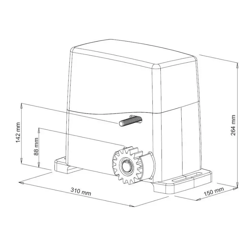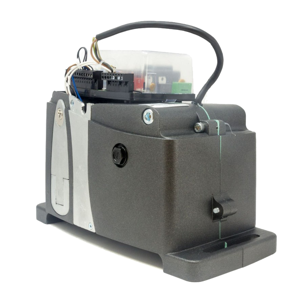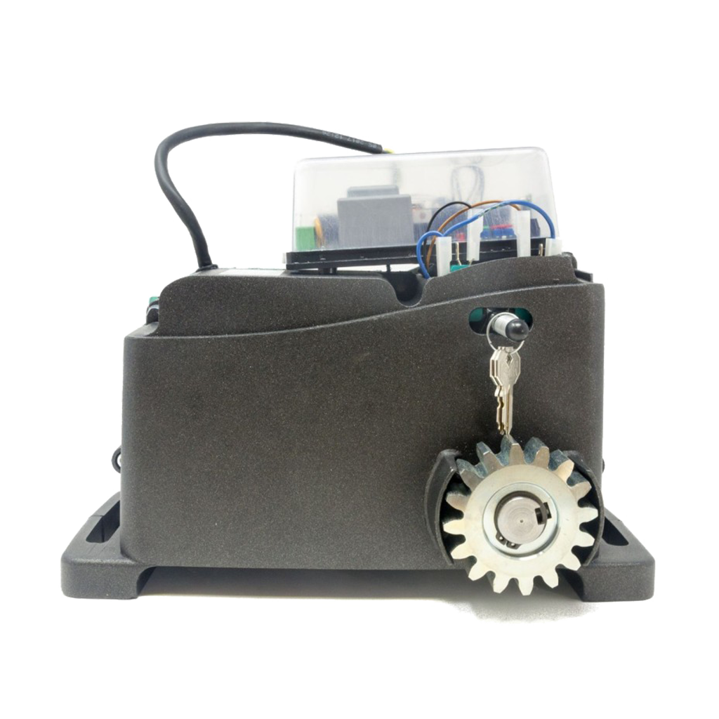 Operador monofásico de 220V para portones corredizos con cremallera de hasta 1600 kg. Motor de alto rendimiento en baño de aceite con engranajes de acero, sistema pre-cableado de fácil programación y dispositivos de seguridad integrados.