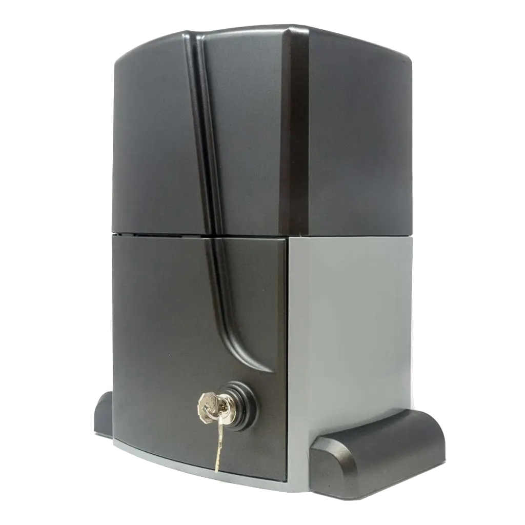 Operador de 220V para portones corredizos con cremallera de hasta 2500 kg. Motor de alto rendimiento en baño de aceite con engranajes de acero, tarjeta de control pre-cableada y sistema de seguridad certificado EN 12453.