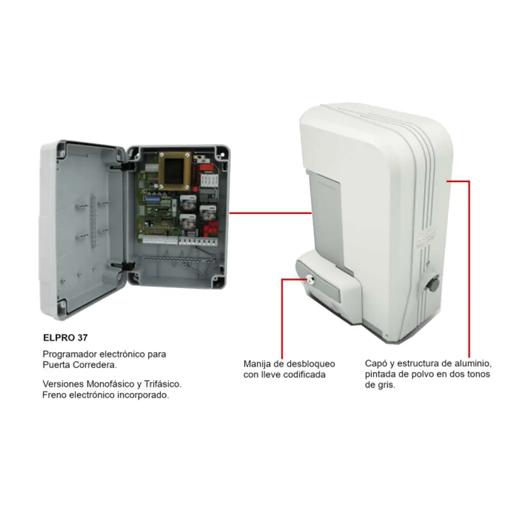Sistema de automatización monofásico de alto rendimiento con encoder inteligente, motor reforzado y protección IP55 para portones industriales y residenciales de hasta 1850 kg.