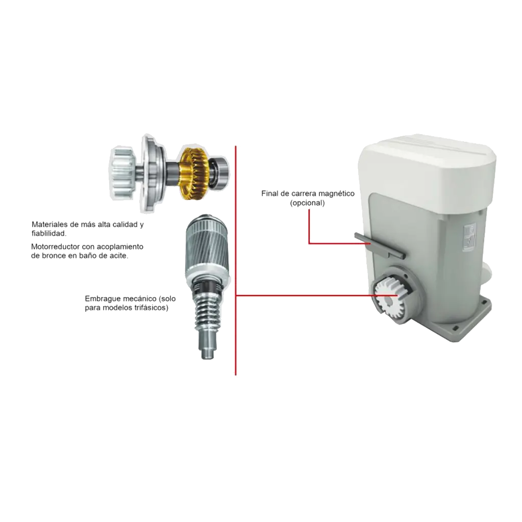Motor reforzado con acoplamiento de bronce-acero en baño de aceite, cojinetes de bolas premium y estructura de aluminio con protección IP55 para resistencia total a la intemperie.