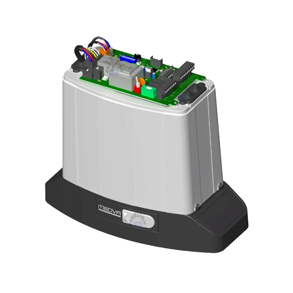 Accionador/motor a 120 Vac para puertas correderas de hasta 1000 kg de peso, adecuado para uso industrial, comunitario y residencial. Equipado con un cuadro de maniobras que incluye un receptor de 433.92 MHz para hasta 255 usuarios, finales de carrera mediante micro switch, programación automática y maniobras controladas por encoder.